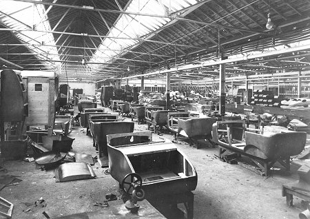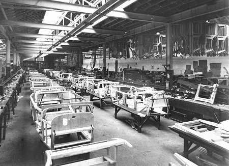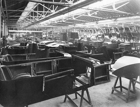 | The Upholstery Shop with Clyno car bodies. Photo