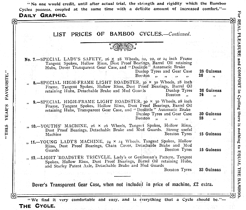 The Bamboo Cycle Company The Bamboo Cycle Company of Holbourne, London, had its works in Petit Street, off Pountney Street, Wolverhampton. Their machines initially had frames made of bamboo because it was very strong, lightweight and free from corrosion. In practice steel proved to be a much better material for the purpose and so only a few real bamboo bikes were made. Later models were made of steel that was disguised to look like bamboo. The bicycles were fitted with the patent 'Doolittle' back pedalling brake and an automatically adjustable handlebar. The machines were only in production for a few years and it is thought that only small numbers were made. The company also had premises in Thomas Street.
