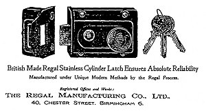 In 1948 Radiant Stainless Products Ltd. of Regent Works, Highgate Road, Birmingham 12, were producing the "Radiant" cylinder rim night latch. In 1953 Security Locks (Birmingham) Ltd. were at Regal Works, 81 Highgate Road, Birmingham 12, and were producing SEDLEEMN and SECLOK cylinder locks, which were said to be of inferior quality. It is not known if there was any connection between the two firms. (CLMS 4/5/1952).