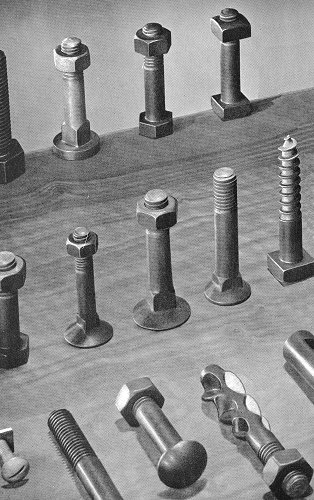 Hexagonal round bolts and nuts, in black, brass, or spun