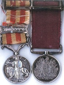 Both medals have "E.T.Handley 38th Regt" inscribed on their edges. The medal with the maroon ribbon is "For Long Service and Good Conduct". The other is the India Medal (dated 1857-1858) with the Lucknow clasp. The ribbon is red and white - supposedly, red for the blood spilled and white for the innocents slaughtered. The Indian Mutiny Medal was awarded, initially, to all armed forces involved in the Mutiny, but later it was also awarded to civilians who had taken up arms in the Mutiny. The Medal is unusual in that, unlike many Victorian campaign medals, it was only awarded for service under fire. Even so, 290,000 were awarded. Five clasps were available and these, of course, are much rarer. There are three clasps relating to the siege of Lucknow: "Defence of Lucknow" for the original defence force and members of Sir Henry Havelock's first relief column; "Relief of Lucknow" for Sir Colin Campbell's relief force; and "Lucknow" for those who, under Sir Colin Campbell, took part in the final operations that resulted in the surrender of the city and the clearing of surrounding areas. As Edward Handley has the medal with the "Lucknow" clasp he must have seen active service, under fire, at the close of the Indian Mutiny in Lucknow.