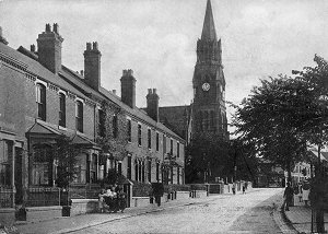 Church, circa 1870s, shows small ‘balconies’ at each corner of the tower